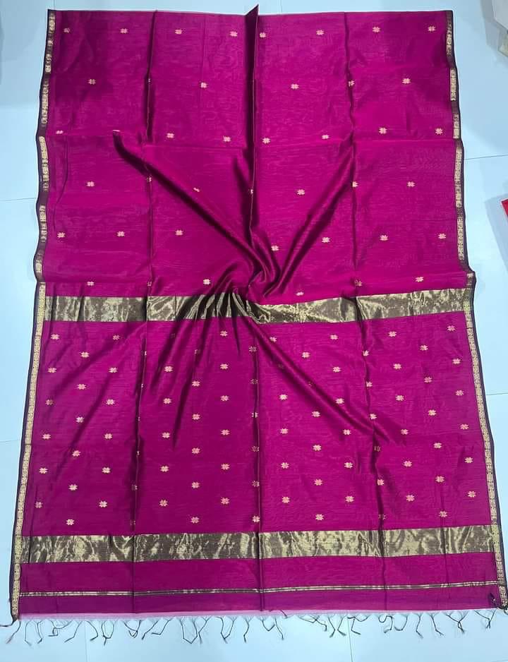 SAMAYU offers a sleek and elegant look with its pure maheshwari silk material and finger wide golden zari border. The floral buttas add a touch of beauty and the matching blouse completes the finest look. Elevate your style with this luxurious and sophisticated piece.