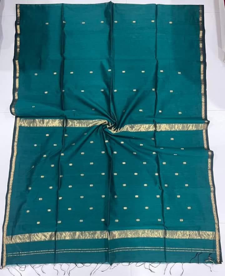 SAMAYU offers a sleek and elegant look with its pure maheshwari silk material and finger wide golden zari border. The floral buttas add a touch of beauty and the matching blouse completes the finest look. Elevate your style with this luxurious and sophisticated piece.