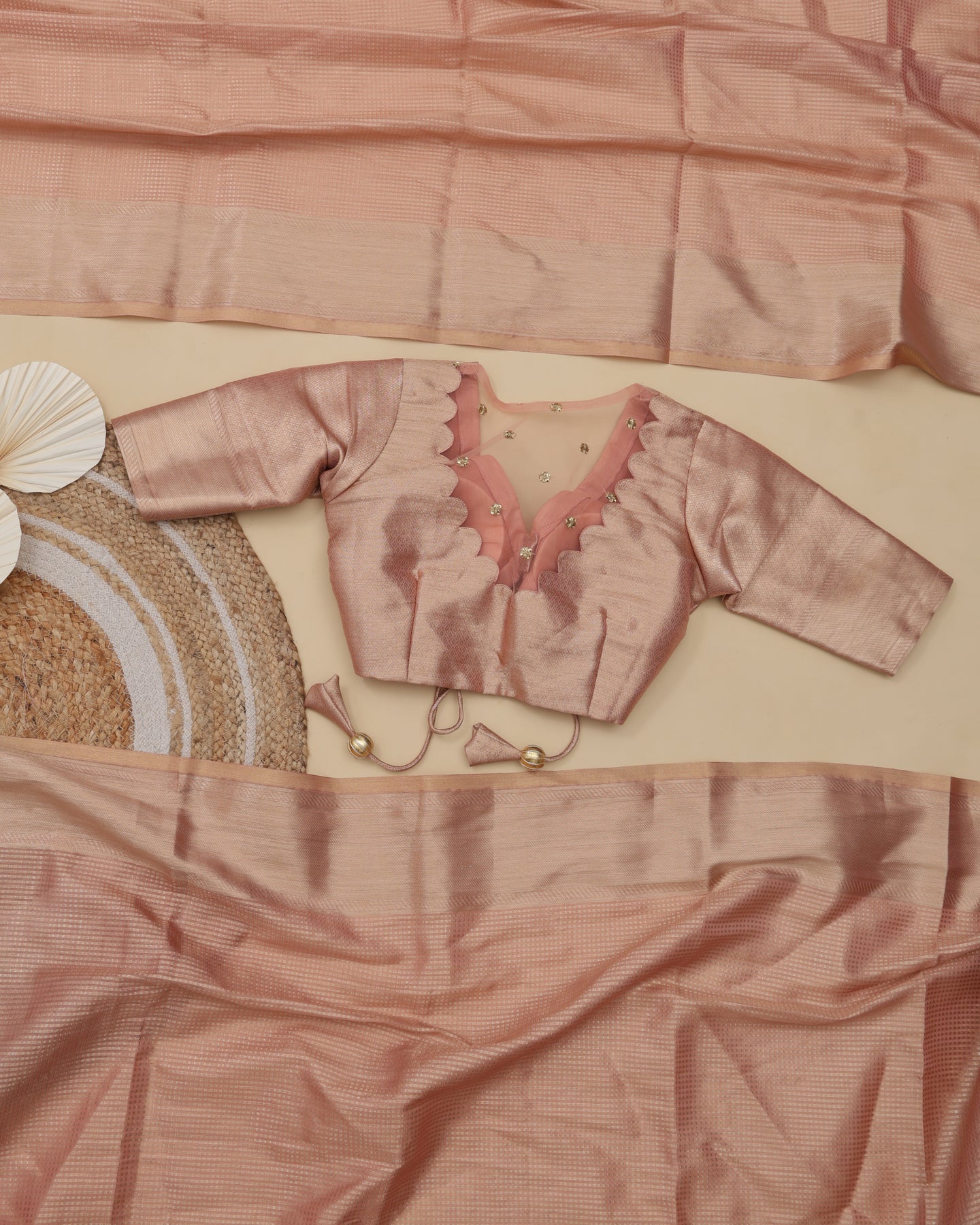 Upgrade your wardrobe with this luxurious pastel blue Banarasi tissue silk saree. It exudes grace and elegance with its rich texture and intricate brocade details. Perfect for any festive event, this saree comes with a beautiful Banarasi silk blouse for a classic draped look. Its delicate design and understated sophistication make it fit for royalty. A timeless piece, this saree is a wardrobe investment you'll treasure for years to come. Made from Banarasi Tissue Silk.