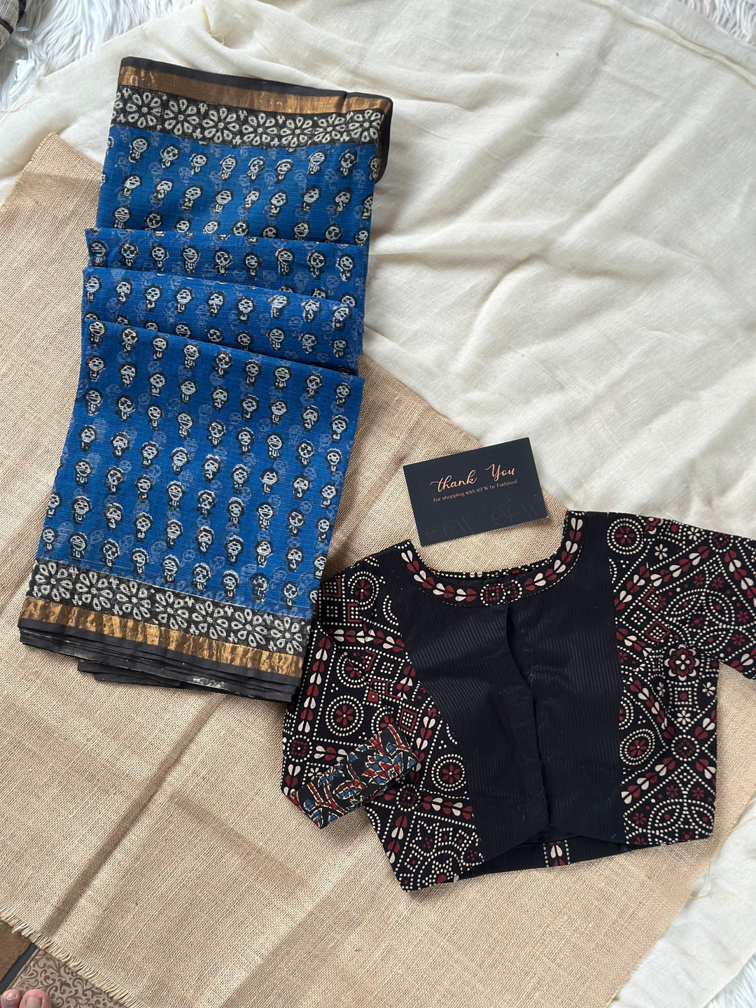 A beautiful soft cozy pure kota doriya saree with beautiful handblock prints with golden zari border