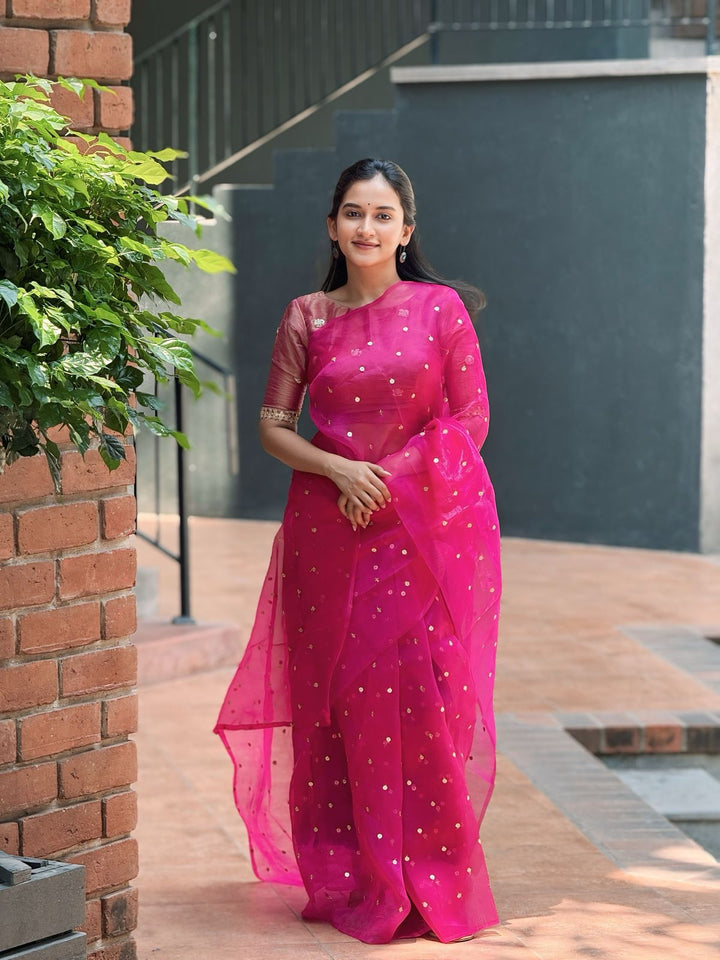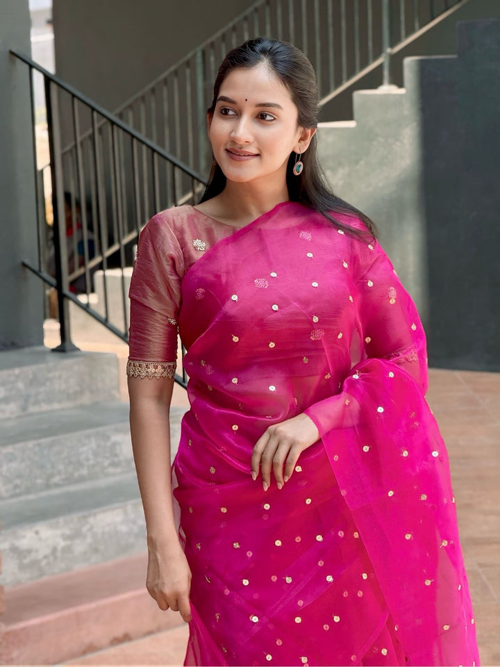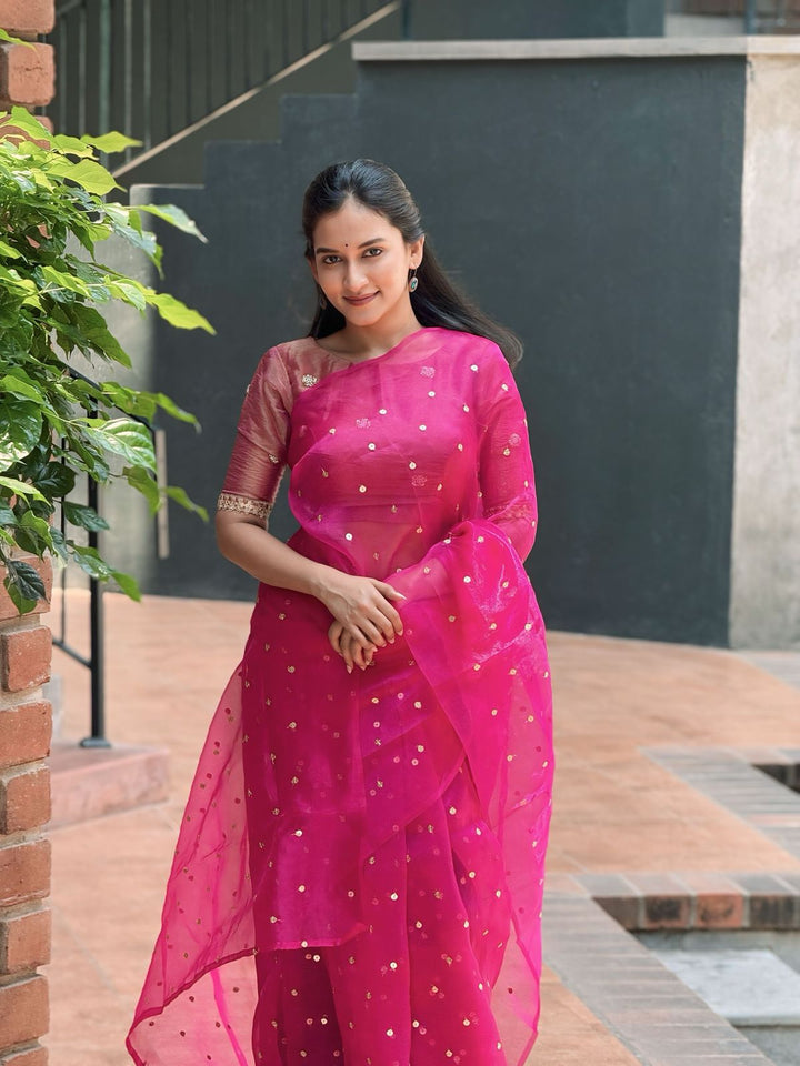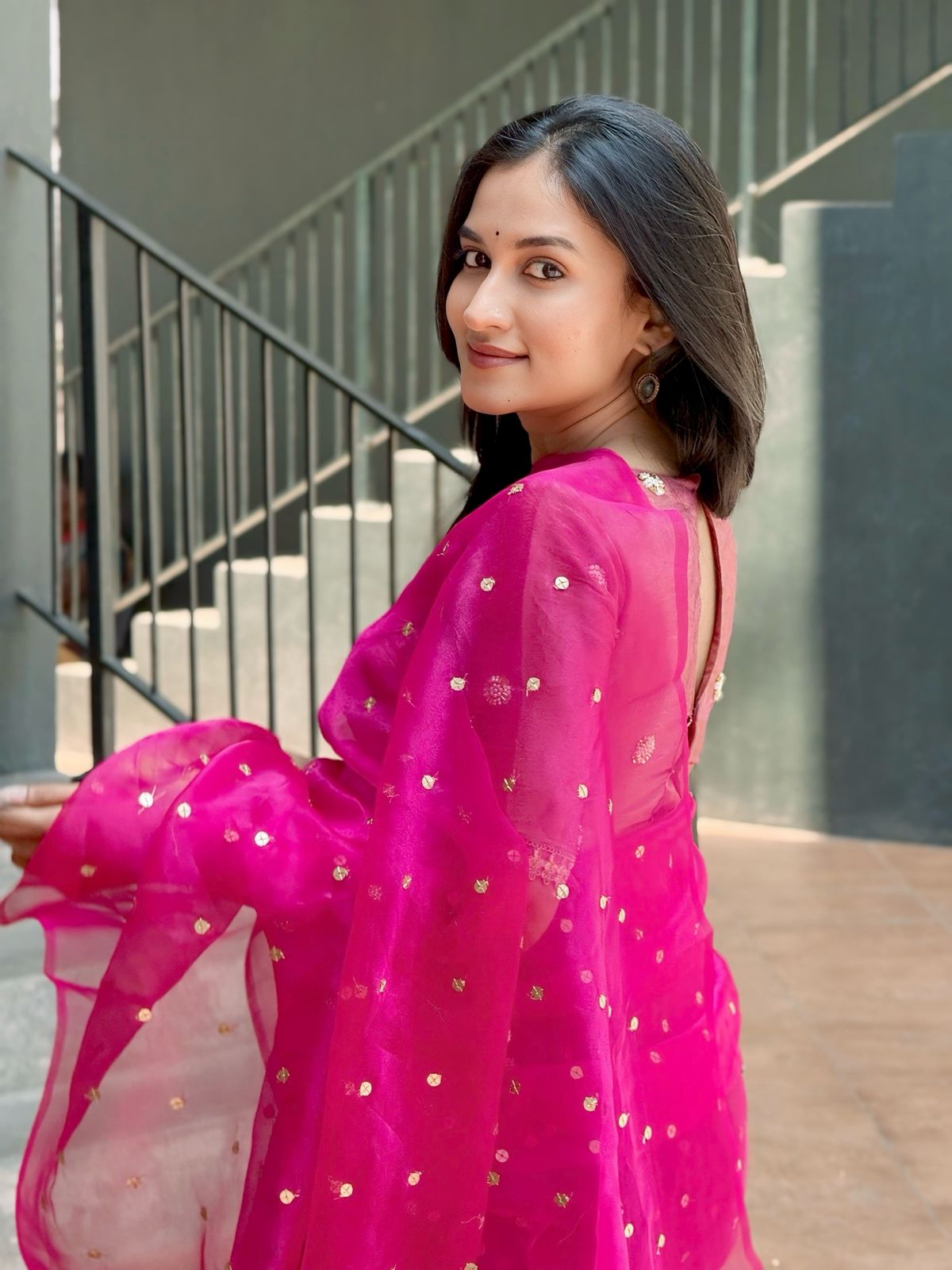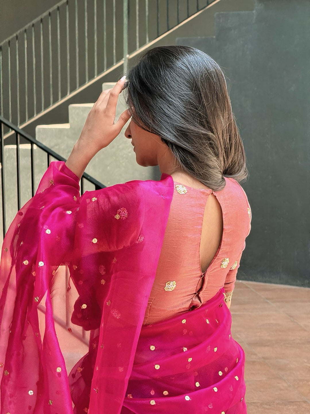 Drape yourself in timeless sophistication with our Luxe saree set, crafted from premium tissue organza for a weightless, ethereal feel. This vibrant Pink tissue saree is adorned with delicate gold sequin embellishments, adding a touch of understated glamour. Paired with a rich, shimmering deep teal blouse featuring intricate floral hand embroidery, this ensemble is a harmonious blend of tradition and modernity. Perfect for evening soirées, festive gatherings, or wedding celebrations, this saree set exudes grace and charm with every drape.